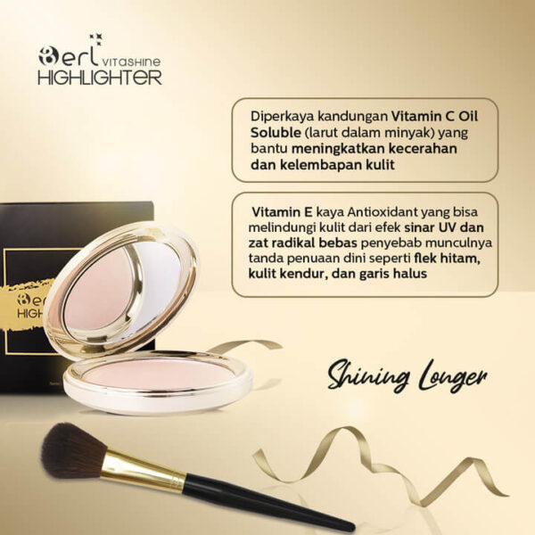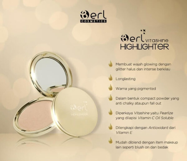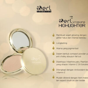 B Erl Vitashine Highlighter adalah produk highlighter dari brand B Erl Cosmetics yang tidak hanya berfungsi sebagai riasan wajah guna memberikan kesan kulit sehat, glowing serta nampak berdimensi namun juga mempunyi nutrisi didalamnya. Di dalam Highlighter B Erl terkandung nutrisi Vitashine (Bahan Pearlize yang dilapisi bahan aktif Vitamin C Oil Soluble) dan Vitamin E sebagai Antioxidant didalamnya.