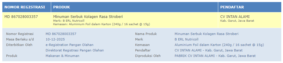 Anda tidak perlu khawatir soal keamanan dari produk B Erl Nutricoll ini, karena minuman kolagen ini sudah terdaftar di BPOM sebagai produk yang aman dengan No. BPOM 867028003357. Selain sudah mengantongi ijin edar dari BPOM, minuman kolagen ini juga sudah mendapatkan sertifikat Halal dari MUI dengan nomor: 00120114450121. Anda bisa menemukan nomor ijin edar disetiap kemasannya.