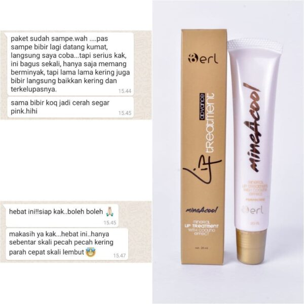 Untuk kedepannya B Erl Lip Treatment akan berubah nama menjadi B Erl Lip Treatment MineACool. Hadir dalam bentuk creamy dan kemasan tube praktis dengan aplikator pemakaian diujungnya sehingga lebih higenis. Selain itu, dilengkapi sensasi colling effect yang akan menyegarkan bibir saat dipakai.