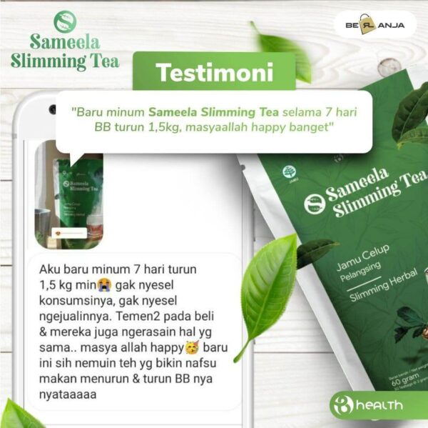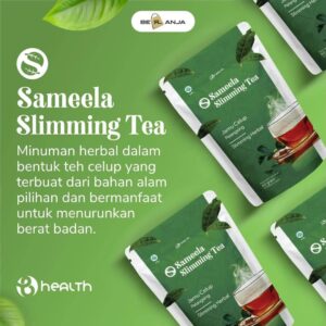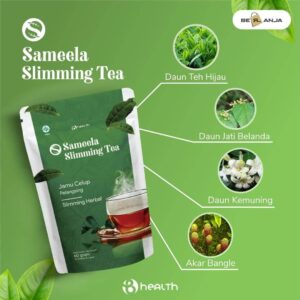 Sameela Slimming Tea adalah minuman teh herbal yang terbuat dari bahan alam pilihan yang bermanfaat untuk menurunkan berat badan. Kandungan utamanya yakni daun teh hijau yang bermanfaat untuk meningkatkan pembakaran lemak, membunuh bakteri penyebab infeksi, mengurangi risiko penyakit kardiovaskular, dan membantu menurunkan berat badan. Selain itu, mengandung daun kemuning yang mempunyai fungsi untuk mengatasi batu ginjal, menurunkan berat badan, membantu mengatasi infeksi, dan menurunkan kolesterol tinggi.